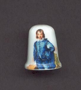 White china thimble. slightly fluted at rim with a print of ÒBlue BoyÓ by Thomas Gainsborough on side. Faint signs of knurling on top. Stamped inside Japan.