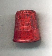 Maroon coloured early plastic thimble with rolled rim. Colour is deeper than shown. Wide plain band above rim then four rows of vertical limes. Round indentations over top. No marks. Crack from rim gradually moving up thimble.