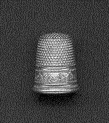 Metal thimble with rolled rim. Wide band of palmatte pattern above then knurling to and over top. Beautiful condition.