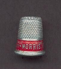 Aluminum advertising thimble with rolled vertically lined rim. Red band above rim advertising ÒMorris Plan Co. Loans & ThriftÓ Knurling to and over top. Inside apex ÒMade in U.S.A.Ó