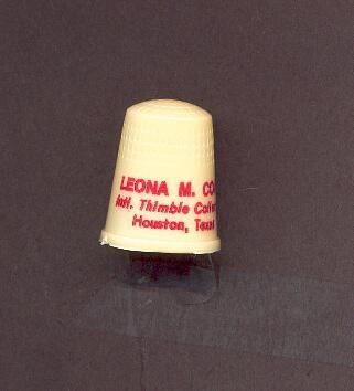 Creamy coloured plastic Personal thimble with red printing. Raised rim, plain band above with ÒLeona M. Coad Intl. Thimble Collector Houston, TexasÓ plus a map of Texas with a Thimble superimposed and ÒHouston Thimble GroupÓ U.S.A.13 in apex.