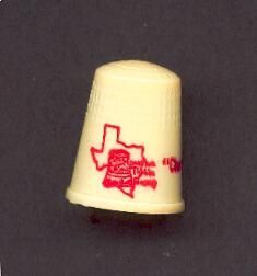 Plastic Advertising thimble with raised rim. Cream coloured with red pntinmg. Map of Texas with Thimble superimposed and ÒHouston Thimble GroupÓplus ÒChartered March 8, 1977Ó U.S.A. 5 in apex