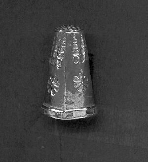 Tall silver thimble, Mexican type. Cinical shape, thin silver, easily marked. Narrow band of abalone shell around base of thimble. Side seamed. Wide plain band (2/3 thimble) with 5 daisy-like flowers around. Square knurlimg to and over top. No marks
