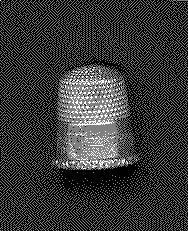 Small thimble - childÕs - silver with patterned rim. Wide band above rim with scene - silo. stone bridge, houses. Cartouche with Sterling 7. Knurling from band to and over top. Inside apex is logo of Simon Bros.