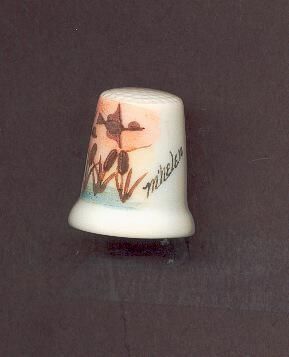 Bisque thimble, off white in colour, hand painted design. Scene of two geese flyimg over bulrushes. Signed MÕHELEN and titled ÒAutumnÓ. Colours mainly pale pinky orange sky, green water, brown reeds and birds.