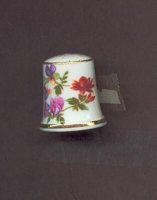 White glazed china slightly fluted thimble. Fine gold line at top,and rim. Decal of floral spray. Knurling on top. Sticker attached with ÒHatfield House so probably made as souvenir type.