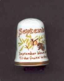 Whiteglazed bone china thimble ,slightly fluted with gold line at rim. Decal of green acorns, and leaves.AlsoÓSeptember blows soft Till the fruitÕs in the loftÓ Inside stamped The Country Diary of an Edwardian Lady Webb & Bower Ltd. 1977 Caverswall England.