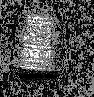 Pewter thimble with narrow slashed rim. Plain band above with ÒNova ScotiaÓ. Knurling above band to and over top. Raised map of N.S. and Cape Breton Island added on knurling. No marks.
