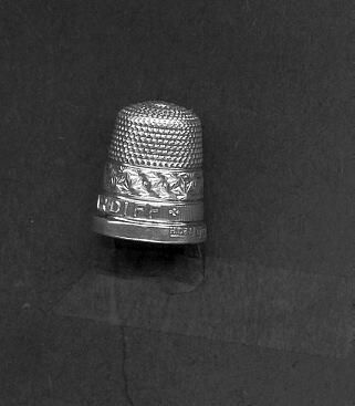 Silver thimble - advertising - with raised band. Band has English hallmarks for Birmingham, H.G.&S (Henry Griffiths & Sons,) 1930, and 16 (size). Also on this band is stamped The Spa. Narrow ribbed band above this with *CARDIFF*. Wider daisy or chrysanthenum band above then knurling to and over top.