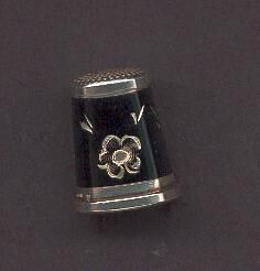 Silver thimble with raised rim. Plain narrow band above then black enamelling all over thimble with added silver flowers.Stamped on band Sterling Germany and the logo for Birks (Canada - Je weller)Back to back BÕs. Knurling on top with the mark of Lotthammer-Eber, Pforzheim, West Germany