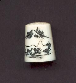 Thimble made friom walrus tusk with engraved design of dogs, dog sleds, whip, Eskimos or Inuit,mountain and trees. Scrimshaw.