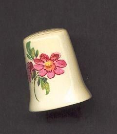 Glazed pottery thimble, creamy colour with two red daisy-like flowers and green leaves on side which are slightly flared. Knurling on top. No marks.