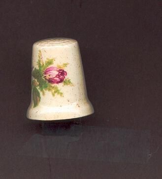 Glazed pottery thimble with flarng to form rim. Cream coloured with flecks and pattern of rose bud and green leaves. No marks. Faint signs of knurling on top.