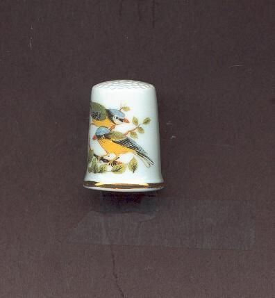 White china thimble, slightly flared at rim with a gold line at rim. Screen print design of two bluegrey birds with yellow breast. on leafed boughs. No marks.