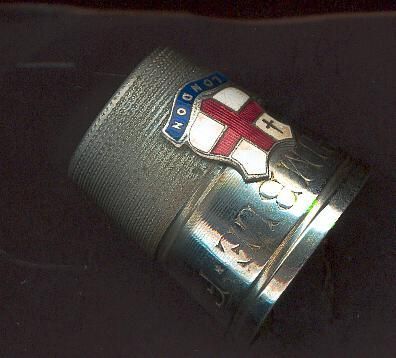 Souvenir drinking measure thimble. Wide band at rim with ÒJust a Thimble FullÓ on it and the Rd number 707065, Knurling from band to and over top. The crest, white with red cross and small cross in upper left corner and London at base has been applied to the thimble partly on band and partly on knurling.