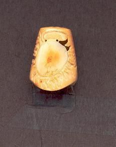 Bone thi mble in tones of beige. Carved design, right through the bone in places. Bottom line is curved. Knurling on top.