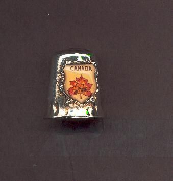 Silverplated thimble with knurling on top. Tall, heavy, slightly flared at rim with added crest. Crest is shield shaped with a red maple leaf with beaver inside and the word Canada on it. Inside marked silverplate.