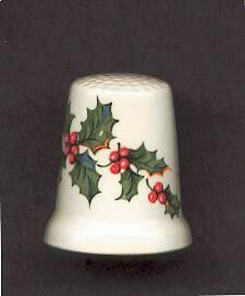 White glazed china thimble, slightly fluted at rim. Spray of holly leaves and red berried around thimble. Decal. No marks. Knurling on top.