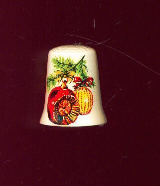 White glazed slightly futed Christmas thimble. Decal design of bough of evergreen tree with 2 Christmas baubles hanging from it - 1 red,1yellow. Top knurled. No marks.
