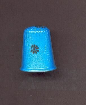 Blue porcelain thimble with 4 gold flowers . Limoges France stamped in gold inside thimble which is white. Knurling from just above flared rim to and over top with one of the gold flowers on top.