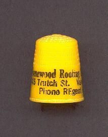 Yellow plastic Advertising thimble with raised rim. Wide plain band with black printing advertising ÒHomewood Roofing & ContÕg Ltd. 2445 Trutch St. Vancouver, B.C. Phone REgent 87-3932Ó Also small circle with Printed in U.S.A. on band. Square or waffle type knurling.