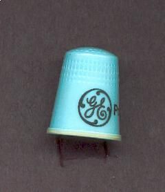 Blue plastic A dvertising thimble with black printing. Circle with GE inside and the word PROGRESS outside. Waffle knurling. U.S.A. 13 in apex.