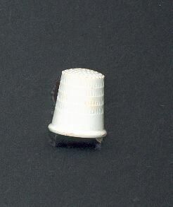 Small white plastic thimble with raised rimWide band above then 4 rows of lined knurling to top, round indentations over top. 8 in apex plus ÒNon Flam Made in EnglandÓ