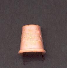 Small pink plastic childÕs thimble with raised rim. Wide plain band above rim then 4 rows of lined knurling to top and round indentations over top. Inside apex 7 along with ÒNon Flam Made in EnglandÓ Slightly larger than #811