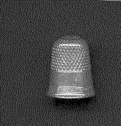 Silver thimble with rounded top, raised rim. Narrow palmate band above rim, then wide plain band above with size 8 stamped on. Knurling from here to and over top. Faint signs of logo in apex, unreadable.