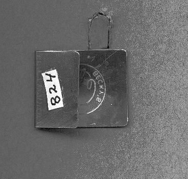 Stainless Steel Finger Protector . 2 inches by 1 inch, folded at 1 1/4 inch. On larger side, a circle with needle and thread and the words Aunt BeckyÕs.