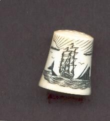 Walrus ivory thimble withScrimshaw work. Slightly raised top with knurling. Design on main body of thimble of a sail boat, walrus in water and sky.
