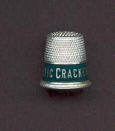 Aluminum advertising thimble with rolled vertically lined rim. Blue band advertising ÒGrants Hygenic CrackerrsÓ Knurling fom band to and over top. No marks.