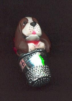 Hallmark Christmas handcrafted ornament. Puppy with long brown ears, white face, red bow sittiing in silver coloured thimble. Thimble stamped Ò12 in arrow Hallmark Cards IncÓBox is marked also - 1989Õs Series Handcrafted OrnamentCollectorÕs Series Thimble Puppy.