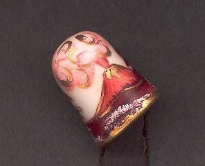 Tall china thimble with rounded top. No knurling.Pinky white basic colour with hand painted scene of a mountain erupting, smoke, trees and rolling land in shades of red with gold accents. Signed Sharron on thimble.
