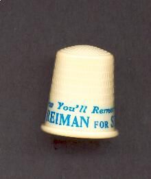 Cream coloured plastic Political thimble with rolled rim.Blue printing ÒSew YouÕll Remember ÒMiltÓReiman for SenatorÓ No marks.
