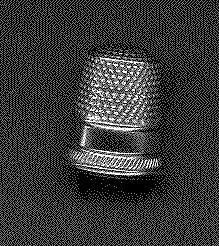 Nickel thimble with rolled rim. Diagonally ribbed narrow band above then a wider plain band with 10 (size) on it. No other marks.,