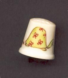 White bisque china hand painted thimble. Green and brown bulrushes on side, green and red turtle other side. Signed ÒNicland Ô79Ó