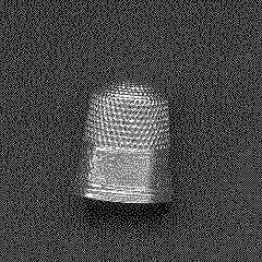 Silver Scenic thimble with raised beaed band at rim. Wide band - scenic type - above with lighthouse, sailboat, house. Cartouche has size on logo of Goldsmith Stern on it.