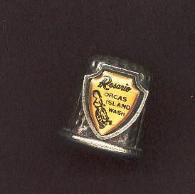 Large heavy pewter Souvenir type thimble with gold coloured plastic disc advertising Rosario Orcas Island Wash. Knurling all over thimble including top. Inside stamped Japan.