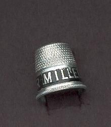 Aluyminum Political thimble with rolled ribbed rim. Black band above withÓMiller For MayorÓ on it. Knurling from band to and over top. Louis F. Dow Co, St,. Paul in apex.