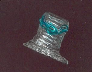 Glass, handblown, clear in shape of hat with brim. Scalloped edge. Blue bird near top.J