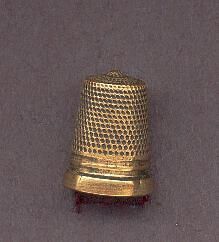 Brass thimble wirh rased rim. Two narrow indented bands with raised band between , then knurling to top. Top knurled to center, Center raised and smooth.