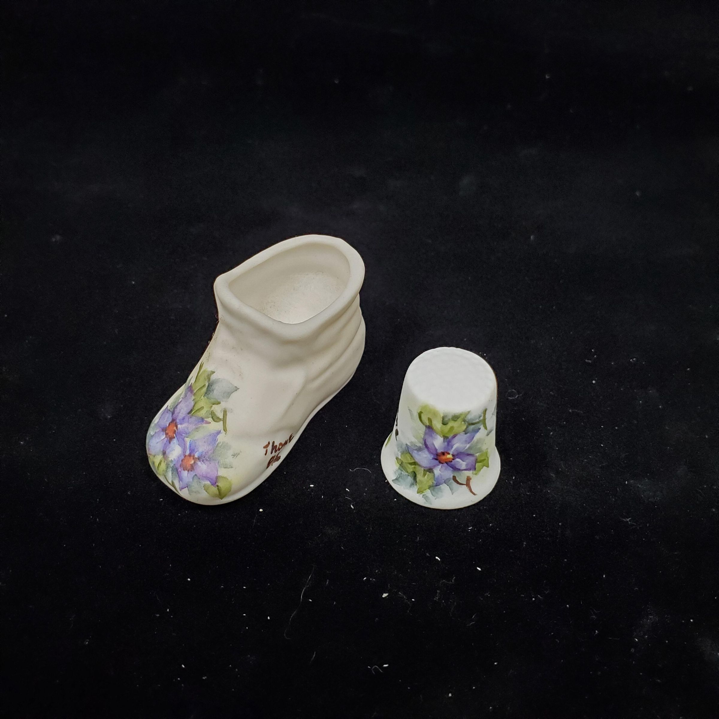 Bisque thimble and Shoe or Slipper Thimble holder. White with hand painted blue c lematis, green leaves. Both pieces signed ÒThone 82Ó