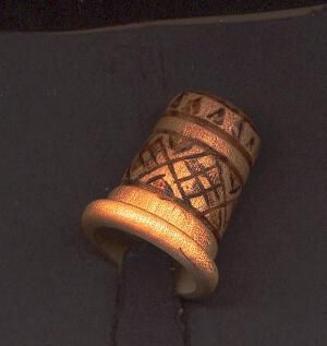 Wooden thimble, large, tall with raised rim. Geometric design carved and burned around main body of thimble. Also burned impressions on top as knurling.
