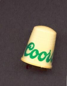 Cream coloured plastic Advertising thimble. with raised rim. Wide plain band above with green advertising ÒCoors beerÓ. U.S.A. 18 in apex.