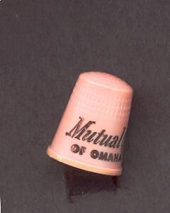 Pink plastic Advertising thimble with raised rim. Black lettering advertising ÒMutual of Omaha Ò and logo. Inside apex U.S.A. 7.