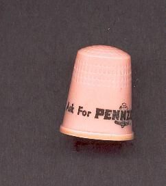 Pink plastic Advertising thimble with raised rim. Black lettering advertising ÒAsk for PennzoiilÓ with logo over it. Inside apex U.S.A. 9