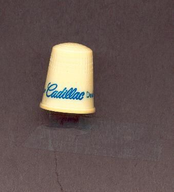 Cream coloured plastic advertising thimble with blue printing. Advertising ÒYour Cadillac DealerÓ U.S.A. in apex.