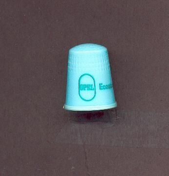 Blue plastic advertising thimble with green lettering on a wide plain border. Advertising ÒOpel EconomyÓ U.S.A. 7 in apex.