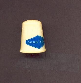 Cream coloured plastic advertising thimble. Advertising in blue. ÒGoodyearÓ in logo plus ÒFor More Good YearsÓ U.S.A. 16 in apex.